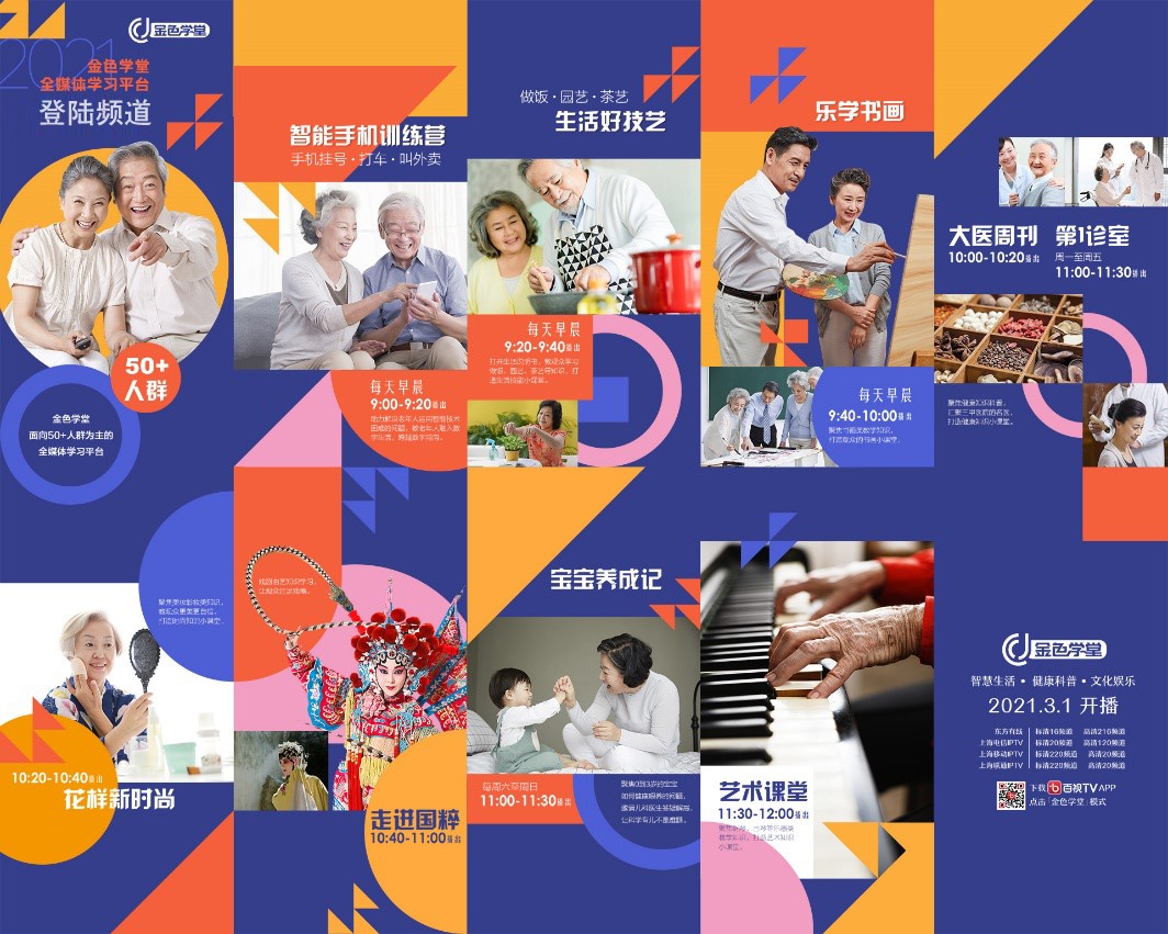 此外,金色学堂还将根据社会及年节热点策划推出专题版面,让老年人能够紧跟时事不落伍。频道节目播出时间遵循老年人的生活作息,首播时段从每天早上9点至12点,每周都有固定的主题栏目和板块,便于形成收视习惯,让观看更舒心。