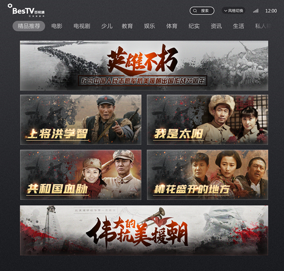 百视通从8月初暑期爱国教育阶段开始,就持续更新爱国主义题材节目,并将延续至10月底,形成了长达三个月的主题宣传期。平台以丰富多元的题材和内容,向用户淋漓展现中国人民志愿军战士的英雄故事和伟大精神。