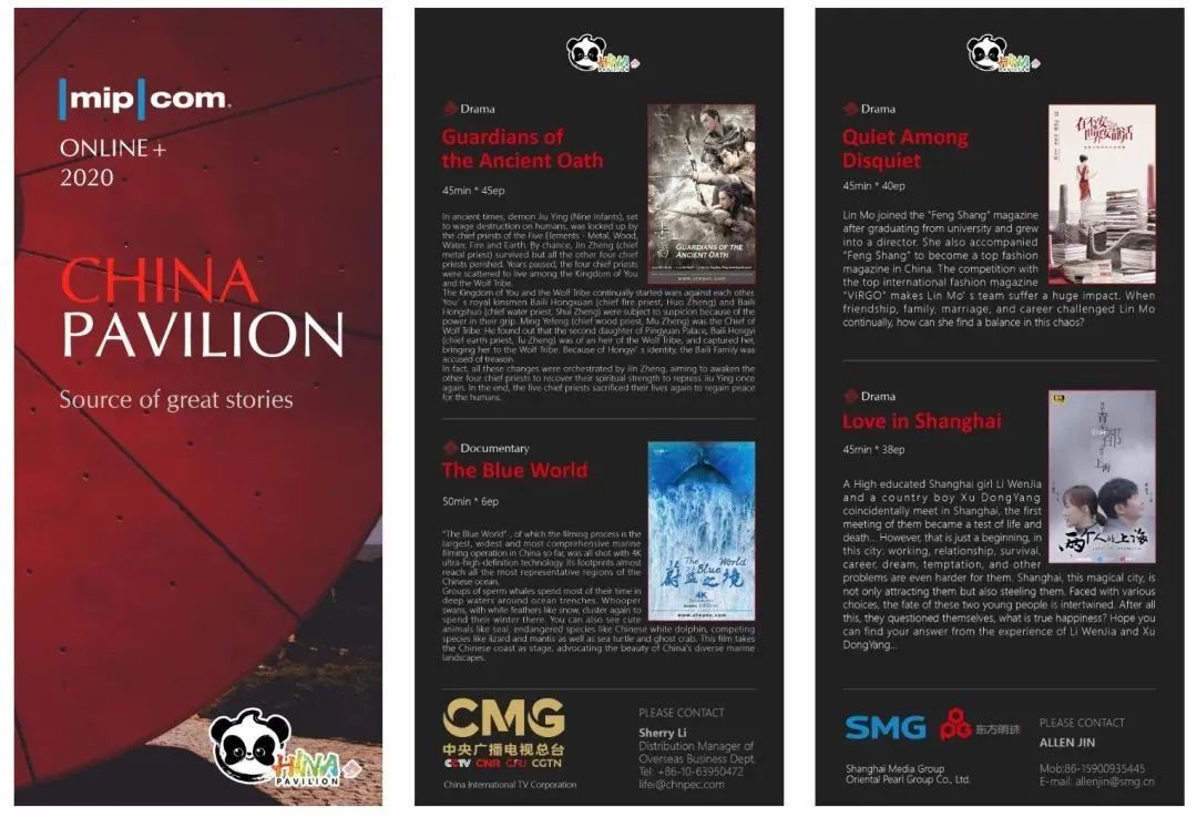此次中国联合展台专区展示的优秀作品超过200部,包括影视作品80余部,动漫作品80余部,纪录片近20部,电视节目、综艺和原创模式等20余部。包括尚世影业出品都市题材剧《两个人的上海》,SMG重点推荐的抗疫作品《人间世之抗疫特别节目》赫然在列。