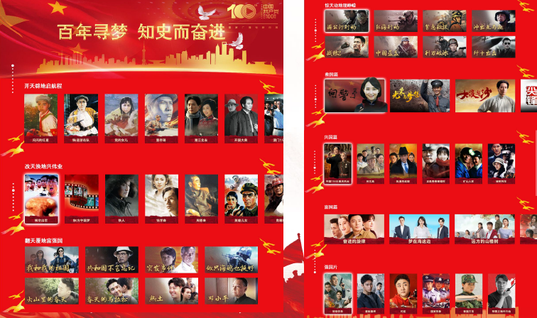 庆祝建党百年优秀电影、电视剧展播涵盖《中国1945重庆风云》、《圣天门口》、《怒放》等聚焦建党核心事件的剧集,《温州三家人》、《大潮如歌》等唱响奋斗强音的剧集,以及《董存瑞》、《铁道卫士》、《狼牙山五壮士》、《地道战》等红色经典电影。