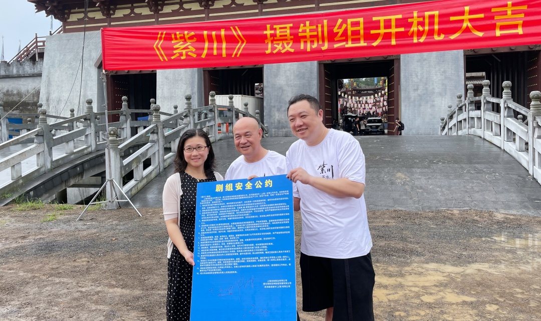总制片人鱼洁、马中骏、白一骢(左至右)共同签订剧组安全公约