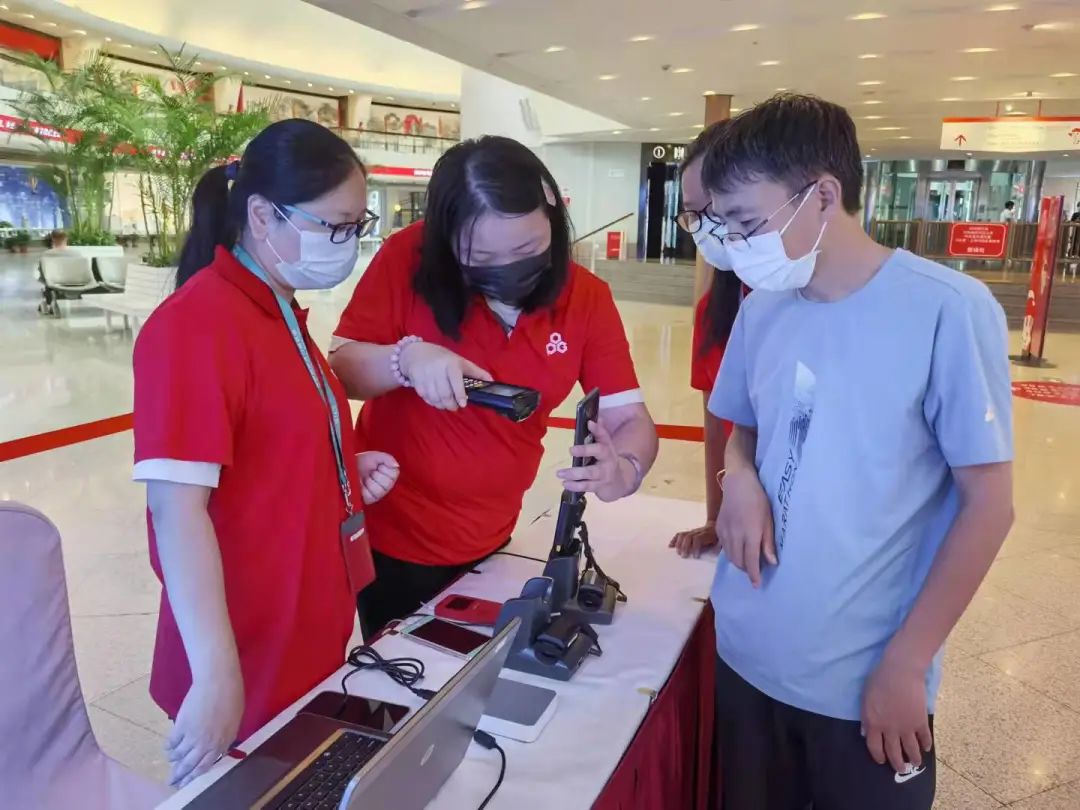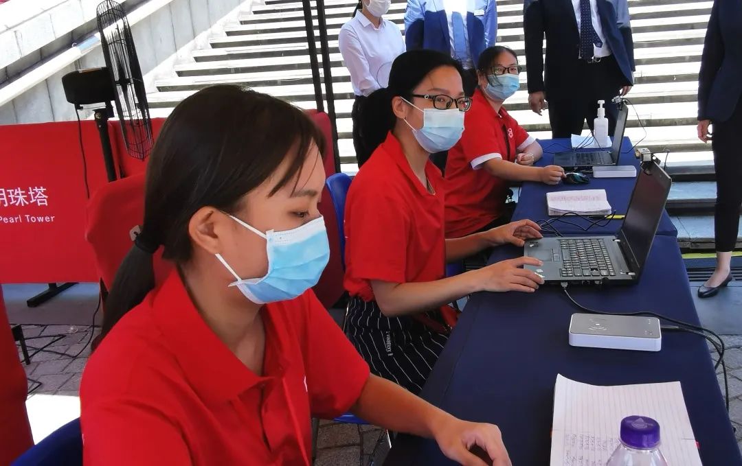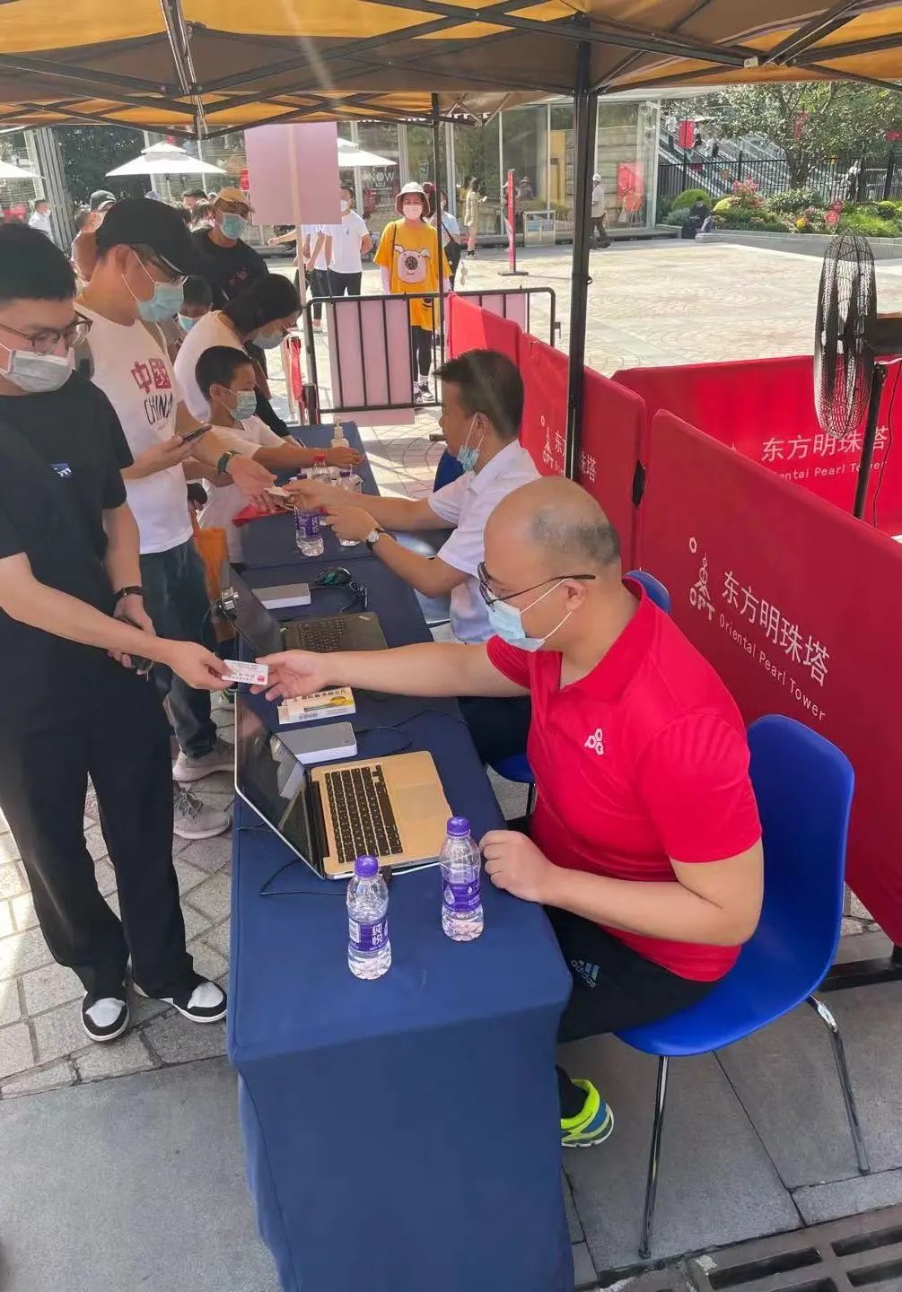塔外的志愿者承担了入塔游客的身份验证工作,引导游客下载“百视TV”APP并注册会员。尽管连日来上海持续高温,面对大量的游客,OPG志愿者们始终耐心疏导,现场排队区秩序井然,各项志愿工作高效运行。