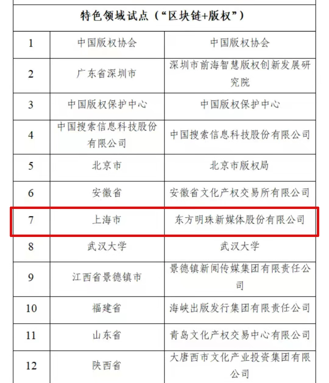 12月22日,《关于国家区块链创新应用试点入选名单的公示》公布,经中央网信办、中央宣传部、国务院办公厅[电子政务办公室]、最高人民法院、最高人民检察院、教育部、工业和信息化部、民政部、司法部、人力资源社会保障部、国家卫生健康委、中国人民银行、国家税务总局、中国银保监会、中国证监会、国家能源局、国家外汇管理局等17个单位和部门的专家评审,东方明珠新媒体股份有限公司(东方明珠新媒体)入选国家区块链创新应用试点名单。公示期为2021年12月21日至2021年12月28日。