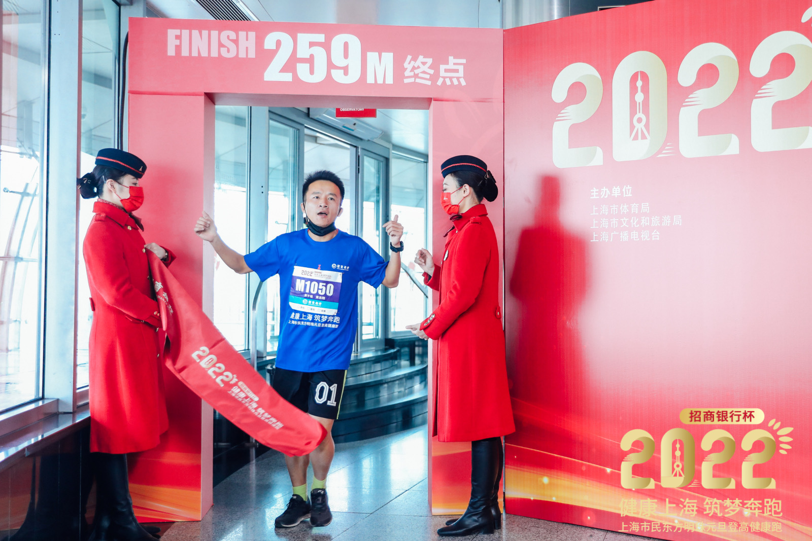 随着发令枪响,来自社会各界的登高选手井然有序、兴致高昂地向位于259米全透明悬空观光廊的终点发起挑战。选手们纷纷合影留念,记录下红红火火的2022第一天。