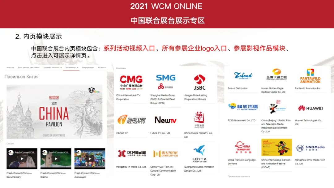 在疫情对全球影视文化交流造成巨大影响的情况下,“中国联合展台”因势利导,顺应特殊历史条件,为疫情下举步维艰的出口型影视机构搭建了参与国际市场的云平台。东方明珠新媒体股份有限公司旗下上海五岸传播有限公司(简称五岸传播)作为“中国联合展台”重要组展单位,负责开展法国秋季戛纳电视节(MIPCOM)、新加坡亚洲电视论坛及市场(简称新加坡电视节,ATF)、俄罗斯莫斯科世界电视内容市场(简称俄罗斯电视节,WCM)三个节展的组展参展工作,同时发挥丰富的优质内容版权库、国际发行网络、平台资源整合等优势,助力中国影视军团“集体出海”。