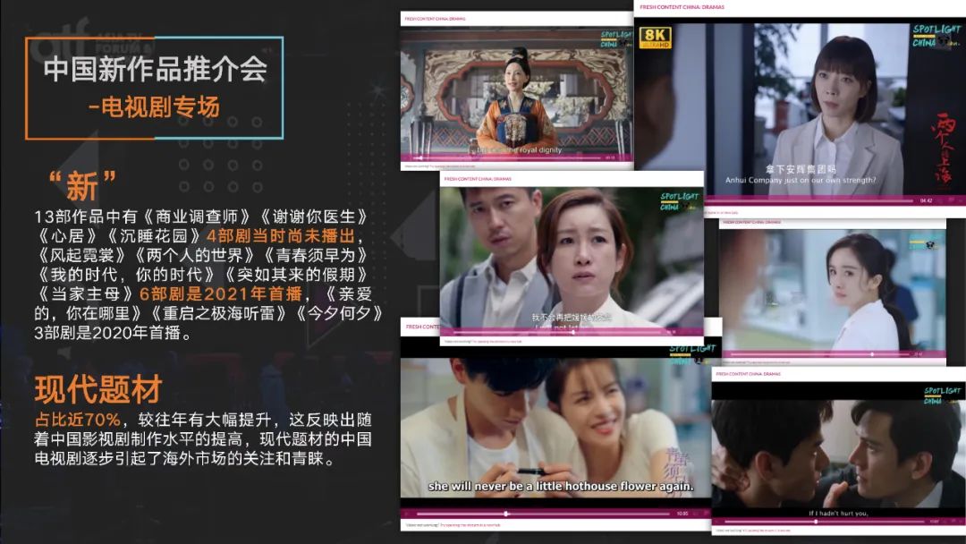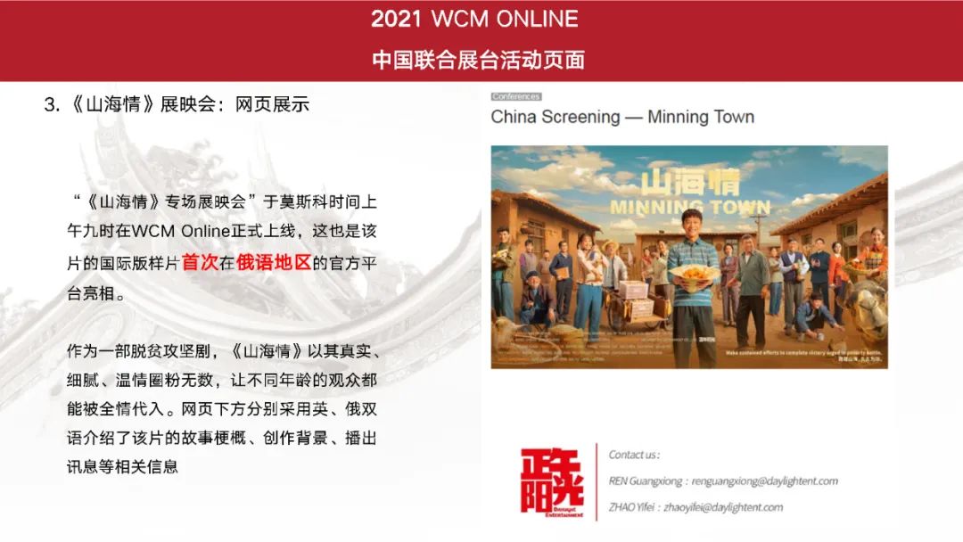 俄罗斯电视节期间,“中国联合展台”举办了2次重要活动。一是中国新作品推介会,通过线上形式向国际买家推荐了14部新品力作,其中包括五部电视剧、六部动漫以及三部纪录片。另一个是《山海情》展映会,针对节展的地域性特点,此次展映的该片国际版分别采用了英语配音、英语字幕,以及中文配音、俄语字幕的两个版本,这也是该片的国际版样片首次在俄语地区的官方平台亮相。