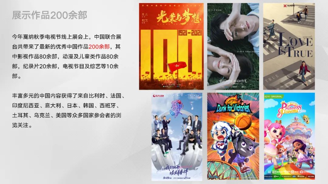 在新加坡电视节线上展会(ATF Online+)上,“中国联合展台”以“闪耀中国”(SPOTLIGHT CHINA)专题页面和各个展商机构主页形式呈现,展示时间为2021年12月1日至2022年6月30日,长达7个月。参加“中国联合展台”的中国机构共计30家,展示优秀中国作品约200部,其中电视剧99部、动漫75部、纪录片12部、综艺9部。