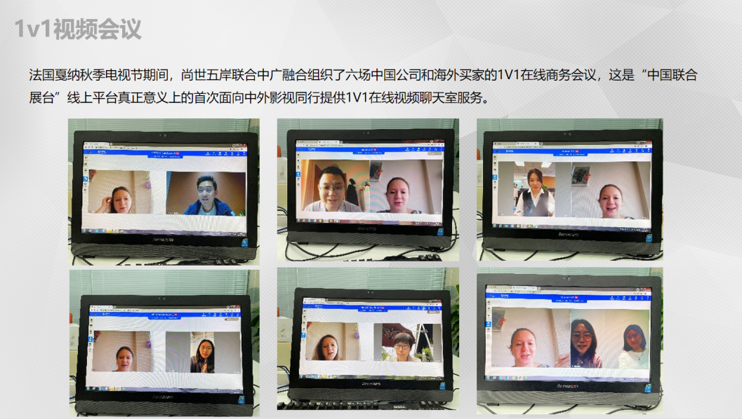 法国秋季戛纳电视节期间,五岸传播联合广电总局中广融合公司组织了6场中国公司和海外买家的1对1在线商务会议,这是“中国联合展台”线上平台首次面向中外影视同行提供这种形式的在线视频聊天室服务。与法国秋季戛纳电视节平台的联动,不仅可以利用国际知名展会的影响力、号召力和流量优势,加速“中国联合展台”在线平台的人气聚集,更可以在实践中发现问题,加速技术和服务升级,达到事半功倍的成效。