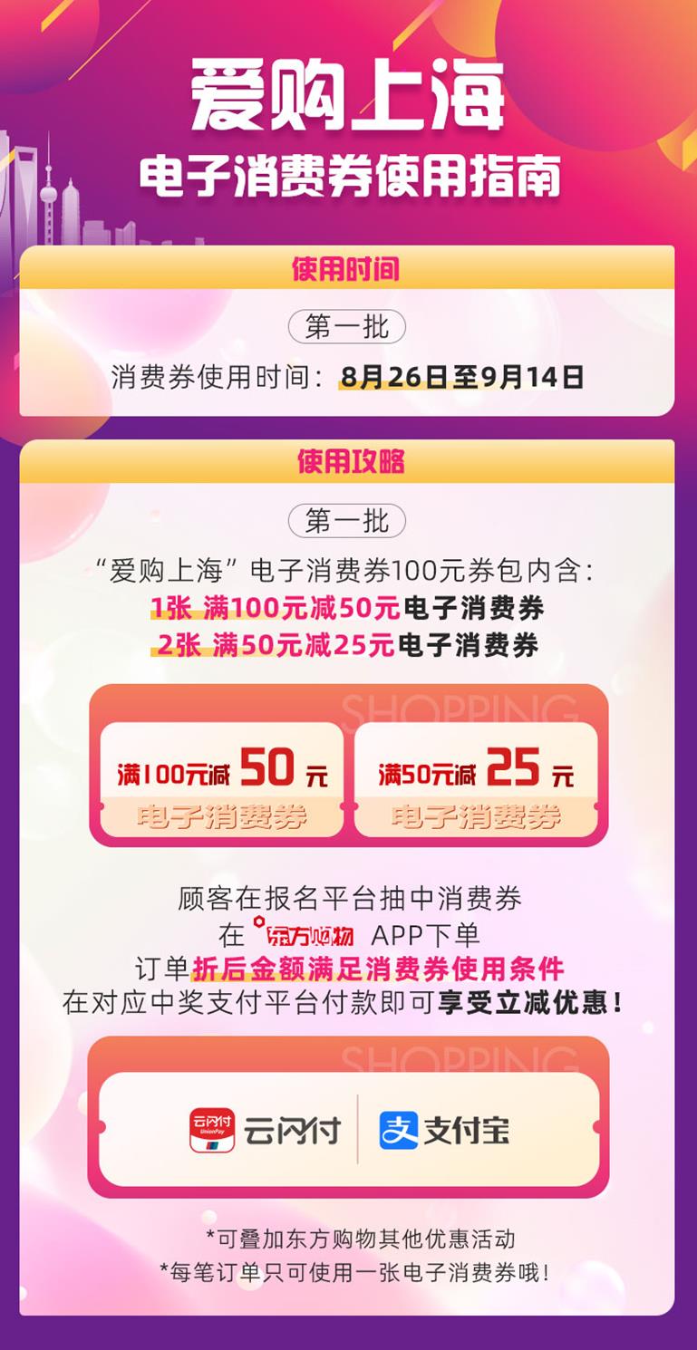 为助力此次“爱购上海”活动,东方购物专门推出“上海专场”“智慧家电”“老字号”等多个优惠专场,并结合九月时令节气和五五购物节重点活动IP,推出一系列特色活动:有将美味时鲜带给广大消费者的开渔河鲜海鲜节、金秋品蟹季;有与格力、大金、夏普等品牌联合进行的“超级以旧换新节能补贴月”绿色消费季活动;还有围绕夜生活节主题举办的“周末云逛街“、”夜市专场“等特惠活动。消费者在东方购物APP购物,通过云闪付或支付宝支付,即可享受满减优惠。