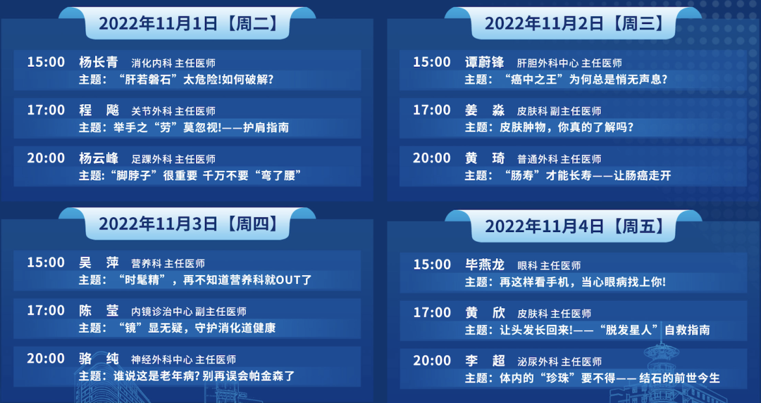11月1日至11月4日期间,百视TV每天推出3场不同主题、不同医生专家进行的健康科普直播,邀请到来自同济医院消化内科、皮肤科、关节外科、神经外科、眼科、营养科等十二个重点科室的十二位专家医生,为大家带来具有实用性、普及性的疾病知识讲解。用户在观看直播的同时,还可以在线提问、聊天互动,沉浸式感受全新的健康服务体验。