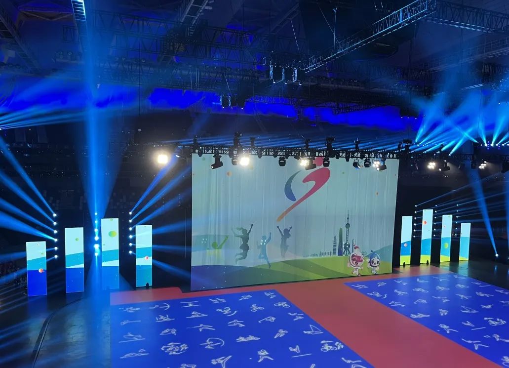 现场以大屏为主视觉,两侧运用对称的四条竖型屏,呈现出动感、向上、拼搏的体育精神。