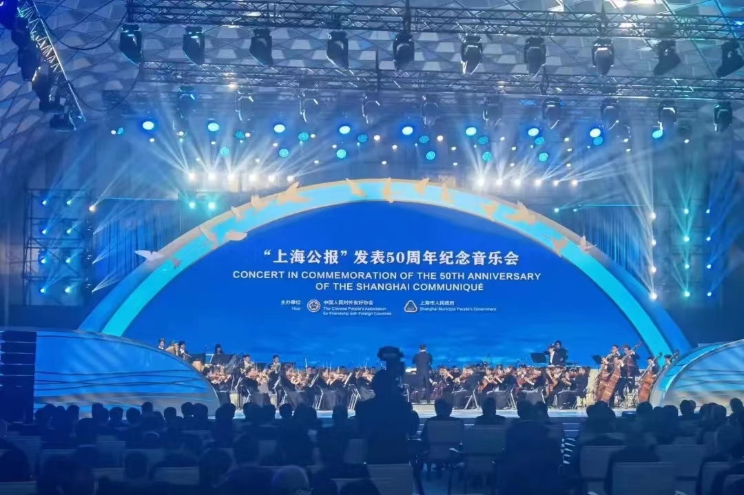 《上海公报》发表50周年纪念音乐会展现 “天堑架飞虹、海上升明月、云开见月明”设计理念,整体呈现以曲线为主,运用代表光明的金色及宽容深邃的蓝色,主舞台大屏被飞虹包裹,加上和平鸽的点缀,栩栩如生。