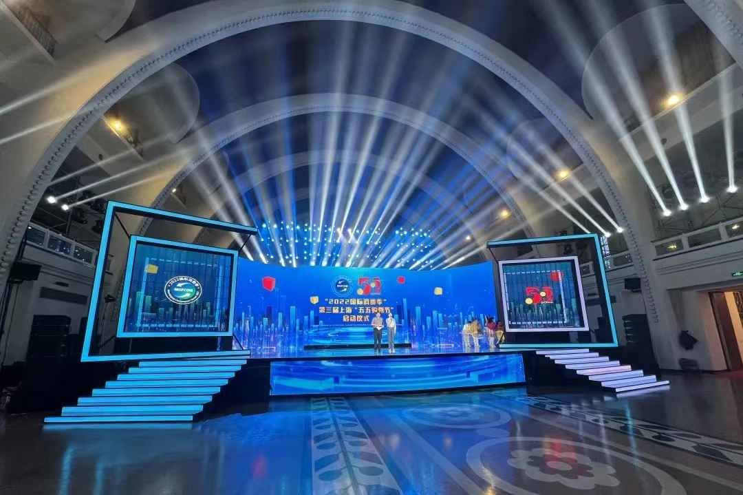 “2022国际消费季”暨第三届上海“五五购物节”启动仪式以“元宇宙”为主概念展开设计,舞台正中设计弧形大屏,两侧叠加方形边框灯箱,寓意从“元宇宙”开始,探索从“场景时代”到“数字时代”的转型。