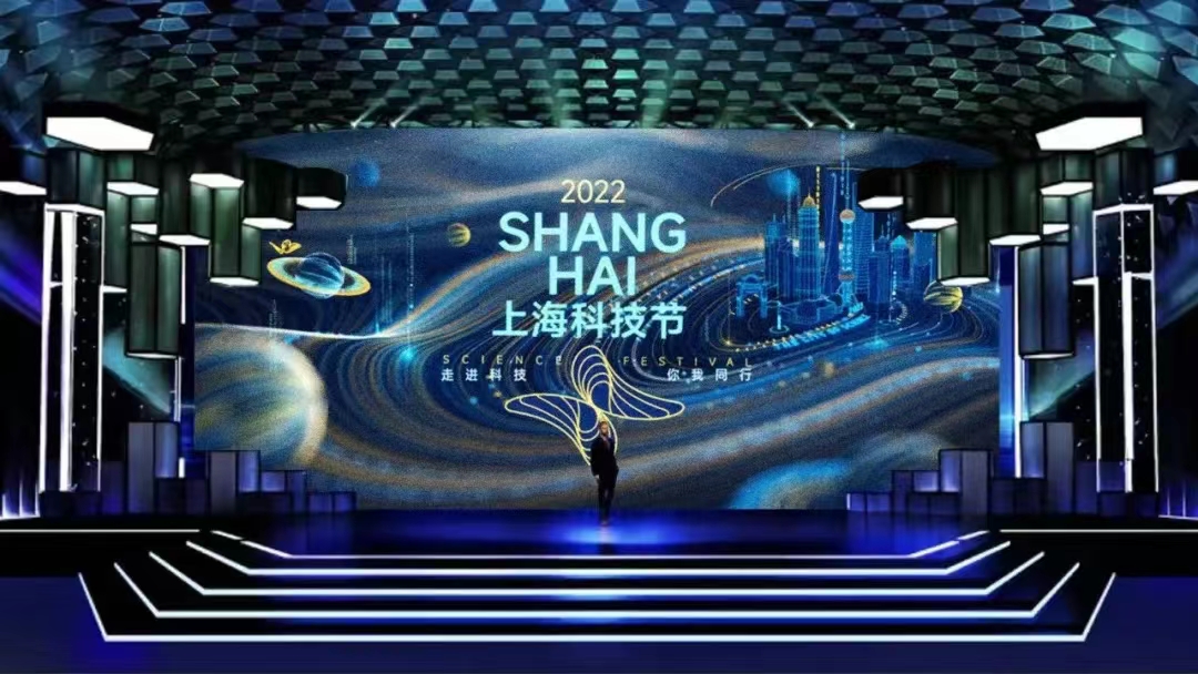 上海科技节开幕式以主舞台两边六角形立柱设计与场馆顶部结构完美融合、遥相呼应,构成视觉一体化设计独特演绎。