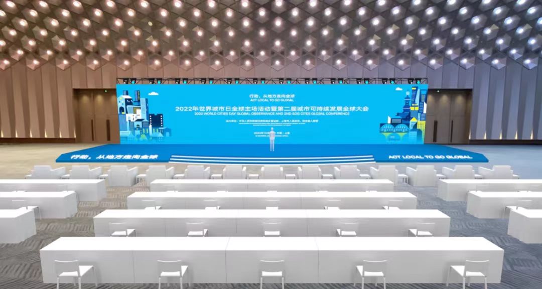2022世界城市日全球主场活动暨第二届城市可持续发展全球大会通过LED长屏幕与主舞台一体化设计,凸显高端会议简洁庄重风格。