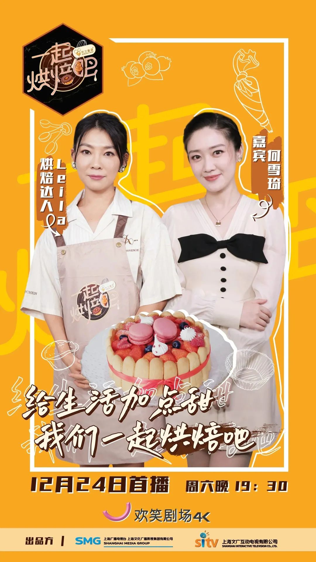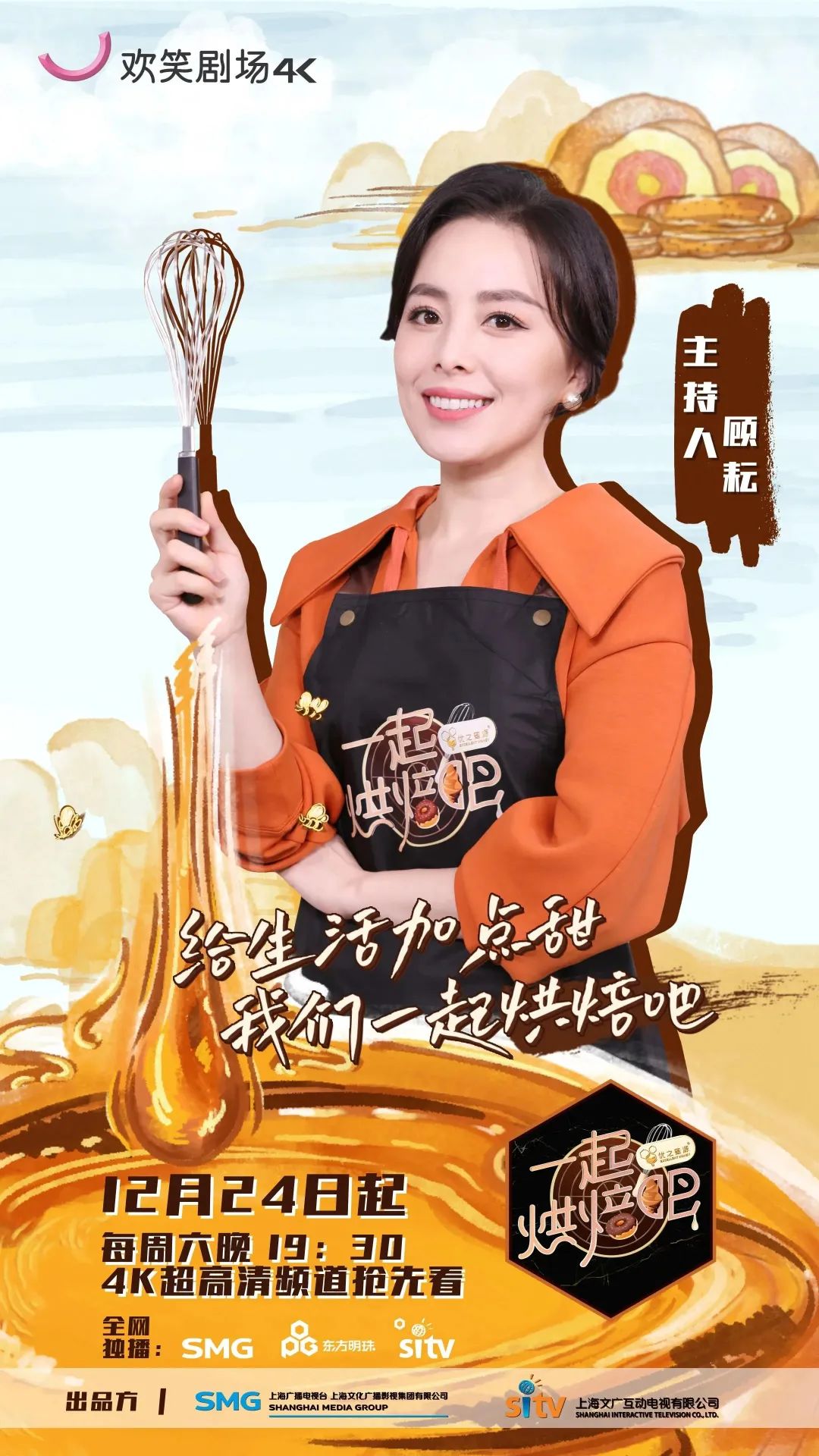 《一起烘焙吧》是继《国厨来了》后,又一档在4K超高清频道欢笑剧场播出的4K超高清自制节目。《国厨来了》让大家体会到“食不厌精脍不厌细”的精致国宴料理,那么这档最新的诚意之作《一起烘焙吧》,将在之后3个月的时间里,带领大家一起进入美妙的甜品世界,用美味甜品和温暖故事陪伴你度过这个冬天。