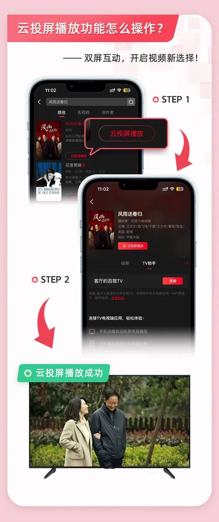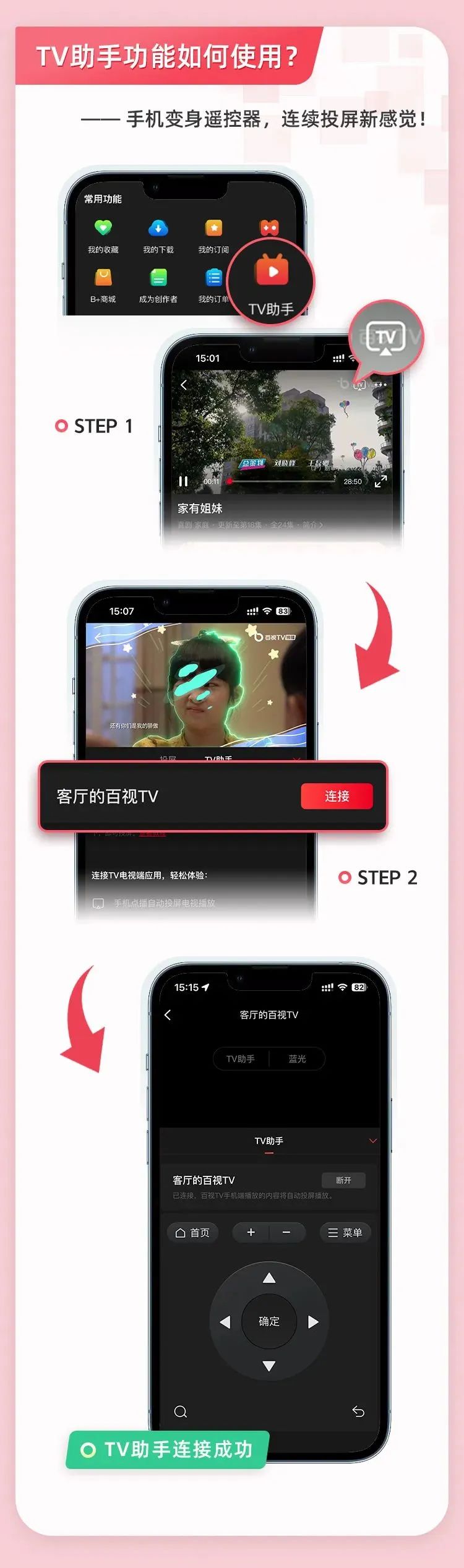将百视TV APP移动端更新至4.9.8版本及以上,百视TV电视版更新至最新的2.0.5版本,就可以进行双屏联动体验新功能啦!