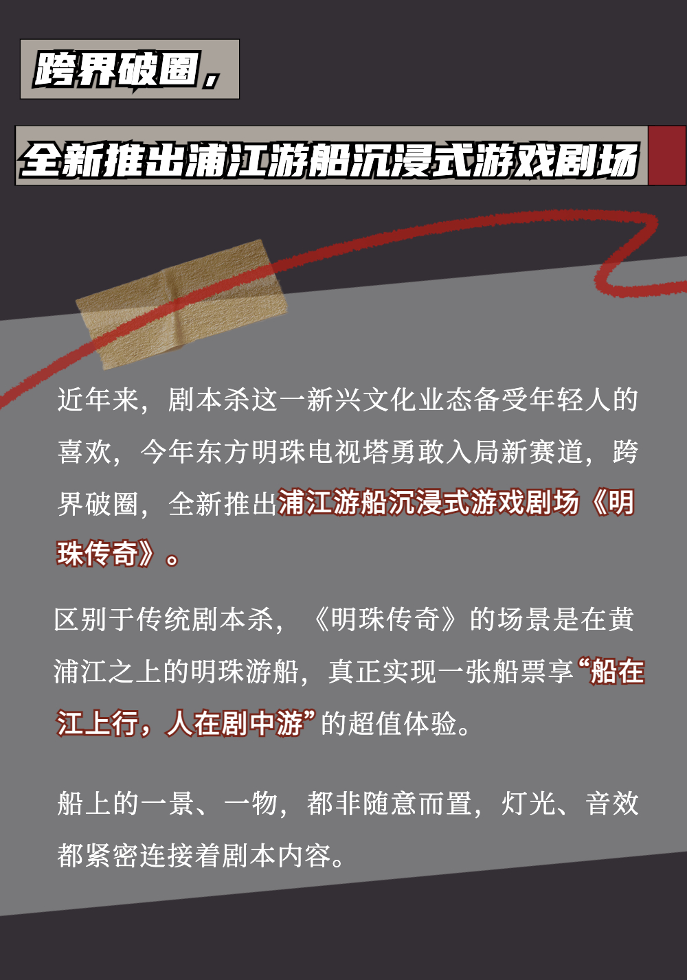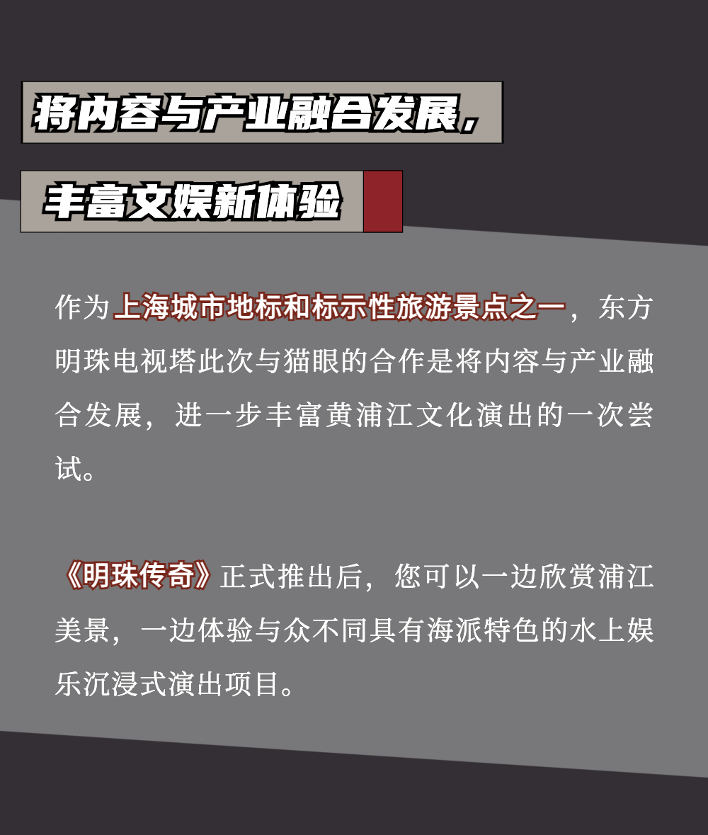 全国首批5A级旅游景点、上海城市地标,东方明珠广播电视塔于4月15日全新推出水上沉浸式娱乐项目,将时下颇受年轻人喜爱的剧本杀搬上游船,率先打造黄埔江上唯一的移动游戏剧场《明珠传奇》,带来震撼人心的360°实景水上娱乐新体验。