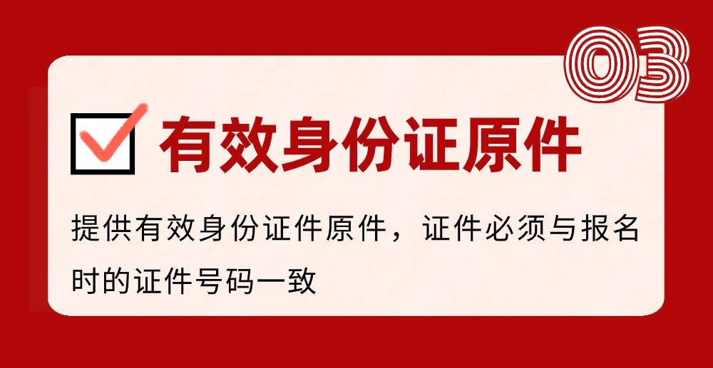 ②有效身份证件原件。证件必须与报名时的证件号码一致。