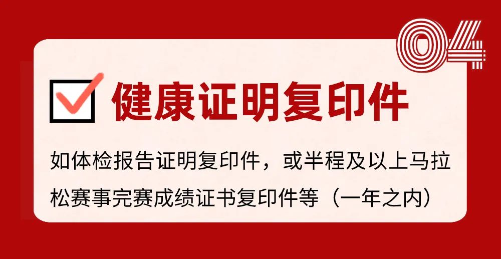 健康证明复印件。体检报告证明(心肺功能、血压、心率)复印件,或半程及以上马拉松完赛成绩证书复印件,或同类垂直登高赛事完赛证书复印件。健康证明材料有效期必须在一年之内(2023年1月1日起)。