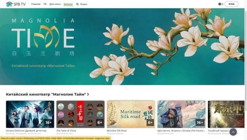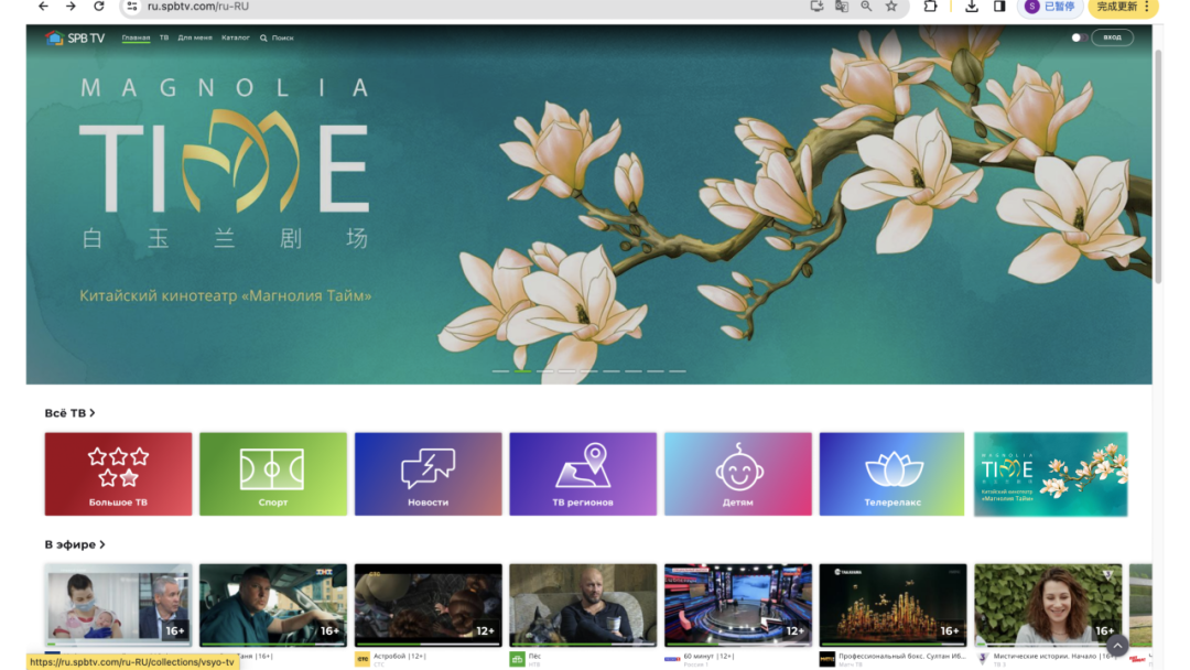 俄罗斯“Magnolia Time”由上海文广国际传播中心成员单位五岸传播团队牵头建立,是与俄罗斯SPB TV及Vintera TV共同打造的商业化运营项目,上线内容涵盖电视剧、纪录片、综艺、动漫等300多小时数十部中国优秀视听内容。