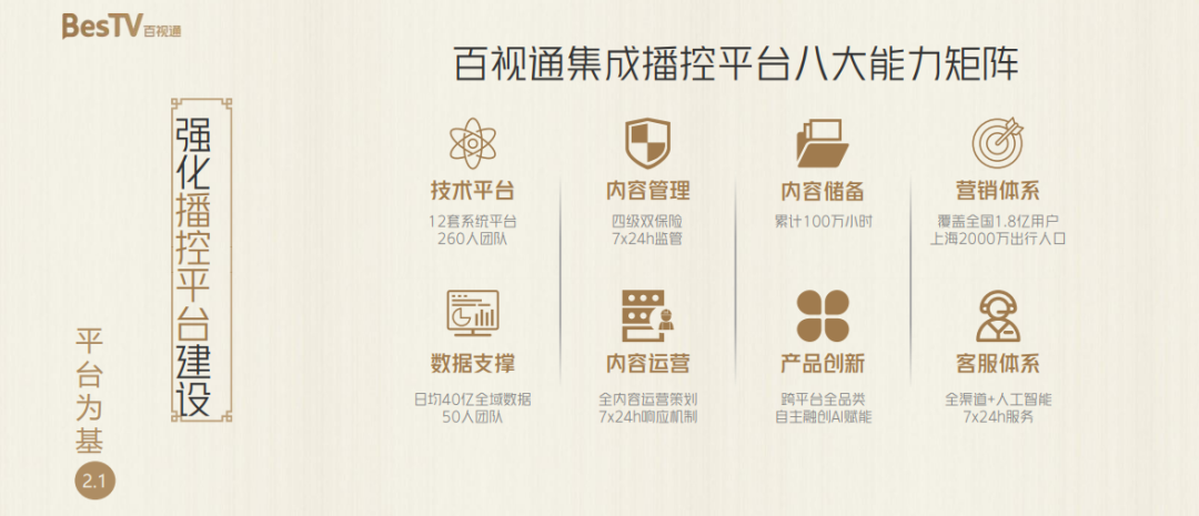 平台能力建设方面,百视通推进技术平台、内容管理、内容储备、营销体系、数据支撑、内容运营、产品创新、客服体系八大能力建设齐头并进。协同发展方面,与西瓜视频在播控、审核、产品等多环节携手推出的互联网电视应用“百视通鲜时光”开启大屏中短视频的极致体验。