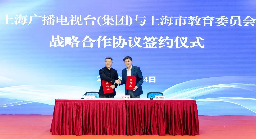 上海广播电视台(上海文广集团)与上海市教育委员会4月14日在上视大厦正式签署战略合作协议。双方将秉持“资源共享、优势互补、互利共赢”的合作原则,联手打造“媒体+教育”深度融合的新平台、新场景、新产品,助力上海建设习近平文化思想最佳实践地,为上海建设与社会主义现代化国际大都市相匹配的一流教育作出新贡献。上海市教育委员会副主任、一级巡视员王浩,上海广播电视台(集团)副总裁王健儿出席签约仪式。