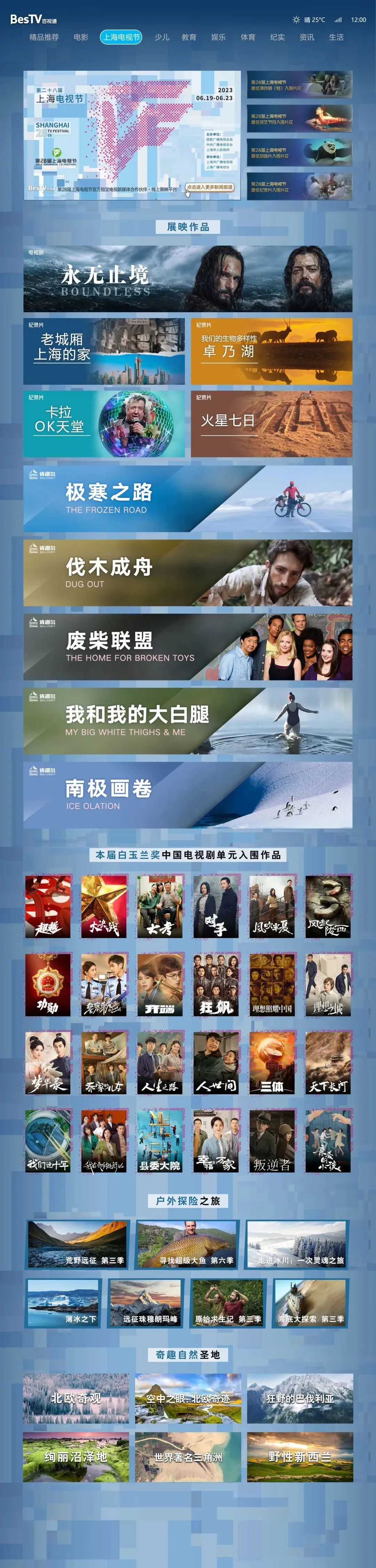 围绕本届上海电视节的各项时间节点,百视通精心策划了“征片展映”、“入围作品”、“线上展映”、“获奖展映”四大阶段主题专区,并在整个六月依次上线,营造荧屏节日氛围。“征片展映”专区围绕电视节组委会的各项盘点梳理,挑选了 80 余部精彩剧集,在电视剧板块里推出“于凡人烟火中探寻温暖光亮”、“生活点滴折射时代变迁”等 9 个策划维度进行预热。