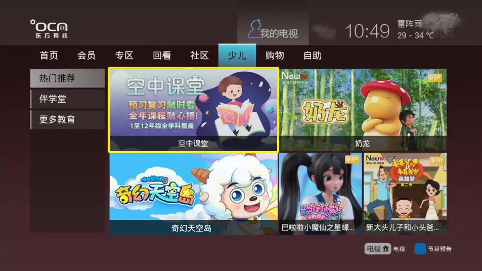 2023年秋季学期即将开始,为持续助力全市中小学线下教学,向广大师生提供教师研修和学生自主学习的数字化服务,在上海市教委指导下,由东方明珠新媒体股份有限公司旗下东方有线电视、百视通IPTV/OTT、百视TV APP等平台提供的“空中课堂”服务将作出新一轮调整:停止12路直播频道课程服务,继续通过东方明珠新媒体旗下各平台点播专区提供小学一年级至高中三年级的学习课程。