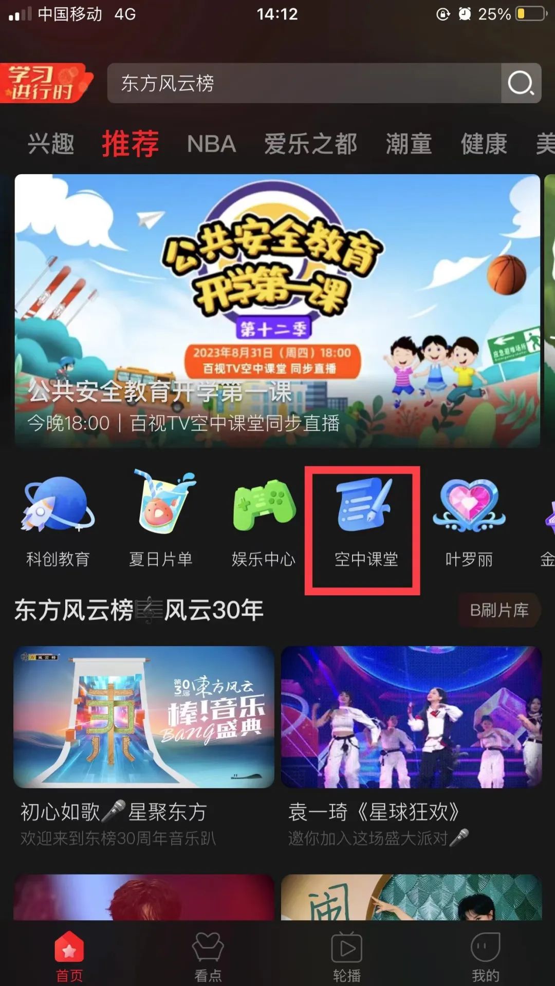 第二步:启动APP后进入首页,点击首页中部“空中课堂”入口,选择年级进入对应页面观看点播课程内容。(附首页图,以实际上线为准)